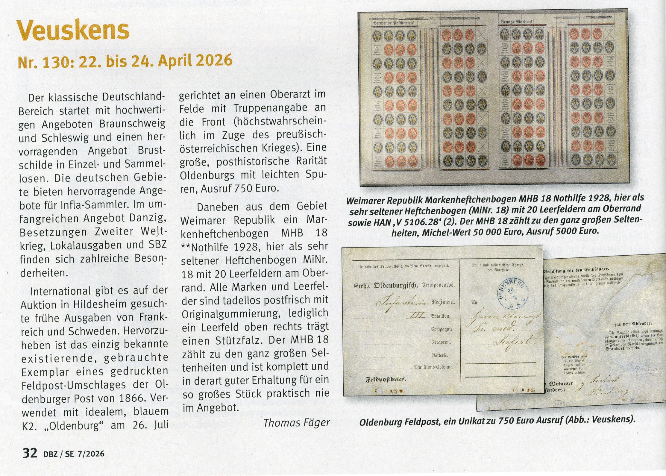 Eine Vorbesprechung unserer 130. Auktion in der Deutschen Briefmarkenzeitung Ausgabe 07/2026.